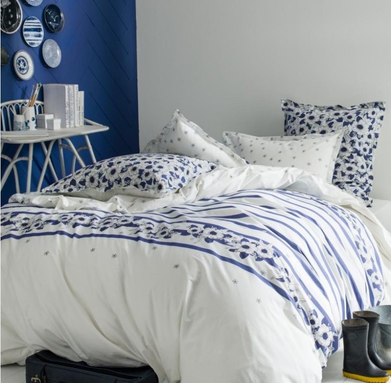 taie d'oreiller Belle Ile bleu-blanc avec fleurs, dim.65 x 65 cm, lavable à 60°, Essix