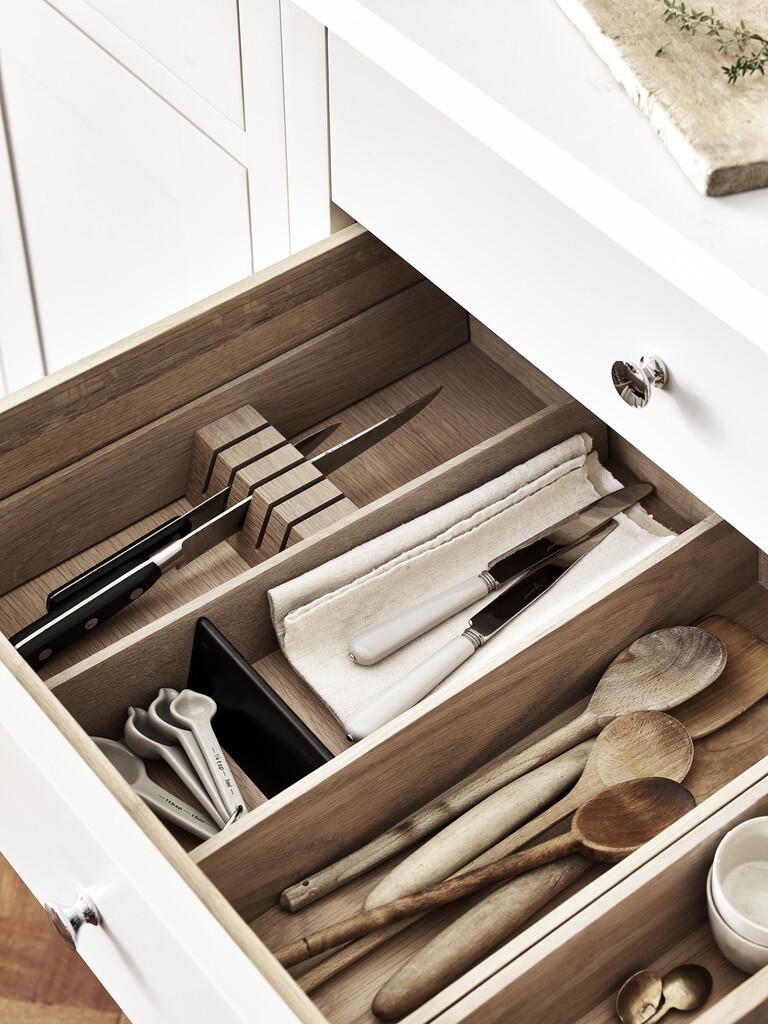 Orford est une collection d'accessoires d'organisation qui s'intègrent parfaitement dans nos tiroirs de cuisine. Ce bloc à couteaux est fabriqué en chêne massif pour compléter nos boîtes à tiroirs, avec des rainures profondes pour ranger jusqu'à cinq couteaux en toute sécurité. Il est conçu pour être placé latéralement à l'intérieur du tiroir, entre deux séparateurs.