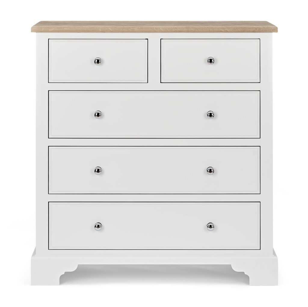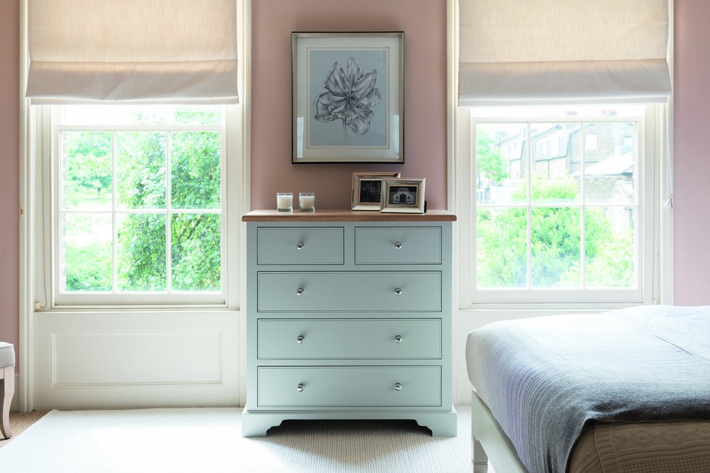 Inspirée par les proportions élégantes des meubles anciens de l'époque géorgienne, cette commode a une haute stature qui offre un grand espace de rangement dans la chambre à coucher sans occuper trop d'espace au sol. Les moulures décoratives sur le devant des tiroirs et les plinthes sculptées font également partie des caractéristiques traditionnelles, tandis que le plateau en chêne massif apporte la chaleur d'une ferme.