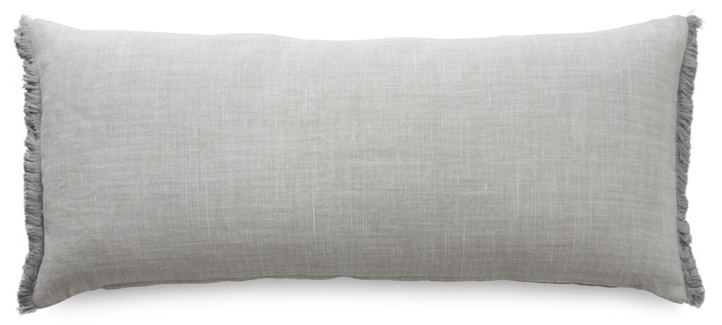 Un coussin polochon rectangulaire extra long parfait pour les canapés, les lits et les bancs, recouvert de notre délicat lin flammé Harry, ici dans notre chaleureuse nuance Cloud, subtilement frangé, rembourré de plumes de canard et discrètement fermé par une fermeture éclair invisible.