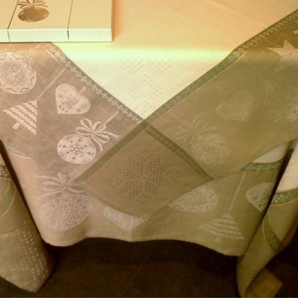 Nappe Joyeuses Fêtes col.perce-neige, dim.175x175cm, 100%lin, lavable entre 40° et 60°, vivement conseillé de tremper l'article dans de l'eau tempérée sans lessive avant la 1ère utilisation, sèche-linge déconseillé, fabriqué en France.