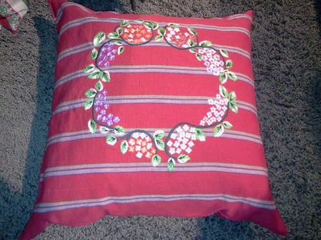 Coussin Gretel col.rouge, dim.50x50cm, 1 face avec couronne de fleurs brodées, 1 face rayée, avec fermeture-éclair, de Pierre Frey