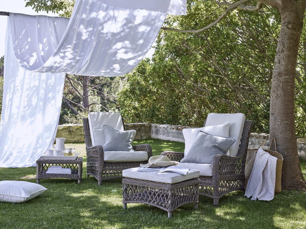 Nous avons conçu ce pouf pour l'associer au fauteuil décontracté Harrington (bien qu'il convienne également à nos autres modèles d'extérieur). Ensemble, ils créent notre version du fauteuil traditionnel : un siège relaxant, mais qui ne ressemble pas à une chaise longue. Lorsqu'il n'est pas utilisé de cette manière, le tabouret sert également de siège d'appoint ou même (sans son coussin) de table d'appoint.
