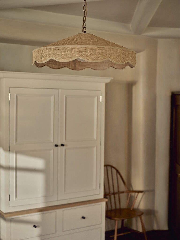 Marina associe des formes festonnées féminines à la texture naturelle du raphia. De style contemporain, avec une finition soignée, cette suspension est livrée avec un grand cache-ampoule opale pour une lumière douce et diffuse. Suspendue à une chaîne en laiton antique, Marina peut être utilisée partout, des cuisines ouvertes aux chambres à coucher.