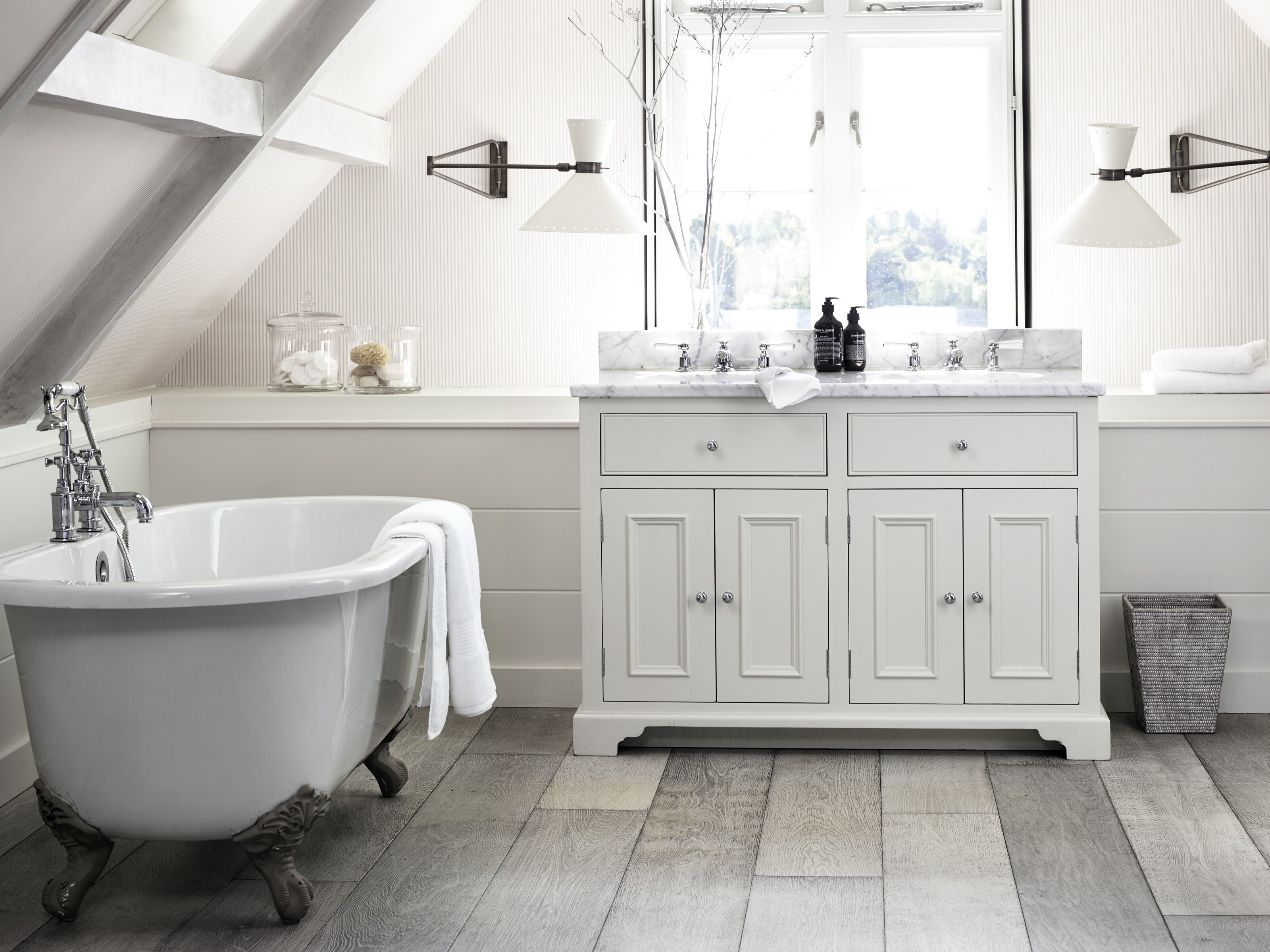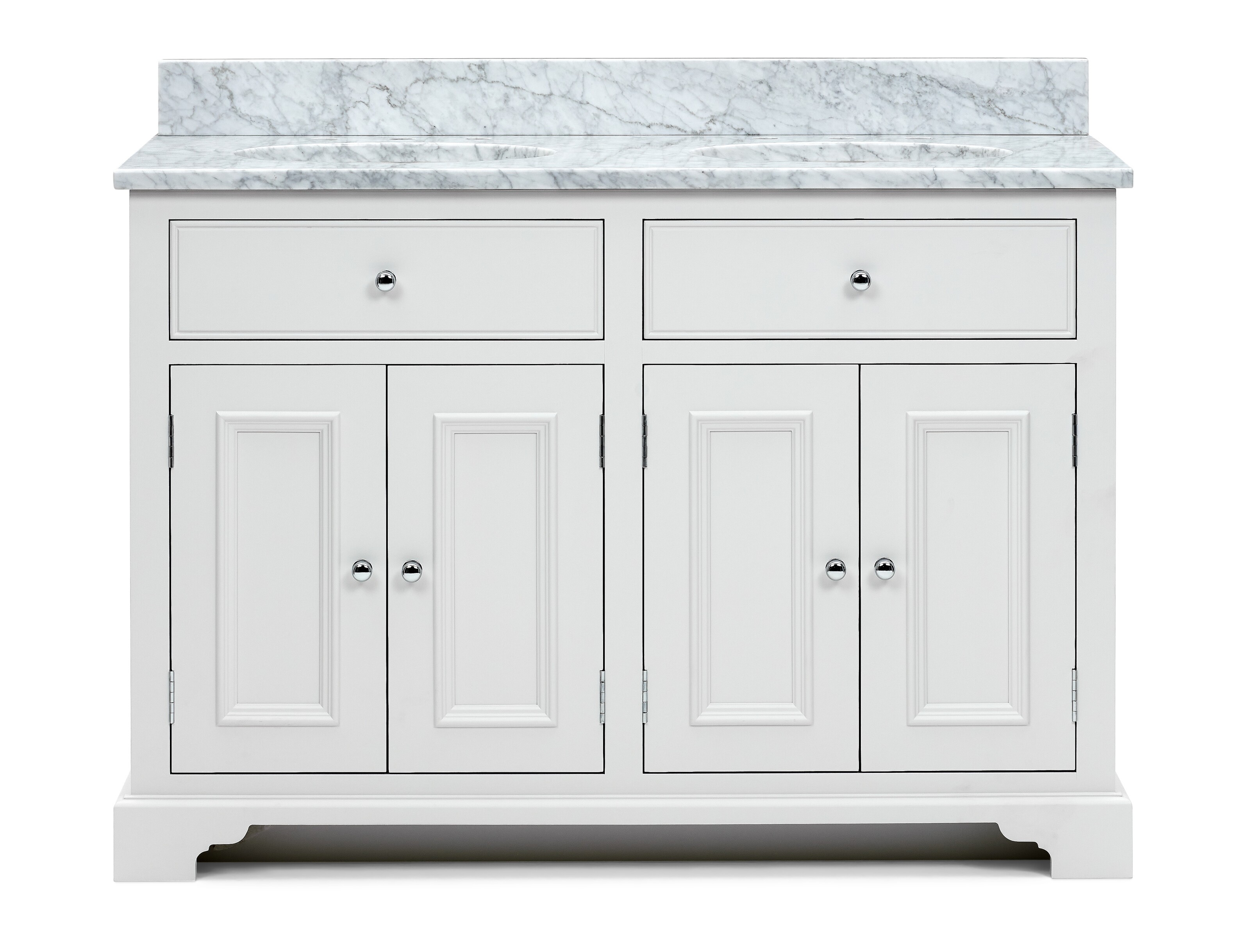 Ce plan de toilette Chichester présente une surface lisse en marbre de Carrare qui lui confère une impression de luxe. Il comprend deux lavabos et deux armoires, ce qui convient à une salle de bains de maître ou à une salle de bains familiale très fréquentée. Les vasques en céramique sont encastrées pour un plan de travail sans joint, avec de fausses façades de tiroirs pour conserver l'aspect traditionnel. Chaque placard abrite une étagère et deux vide-poches en chêne.