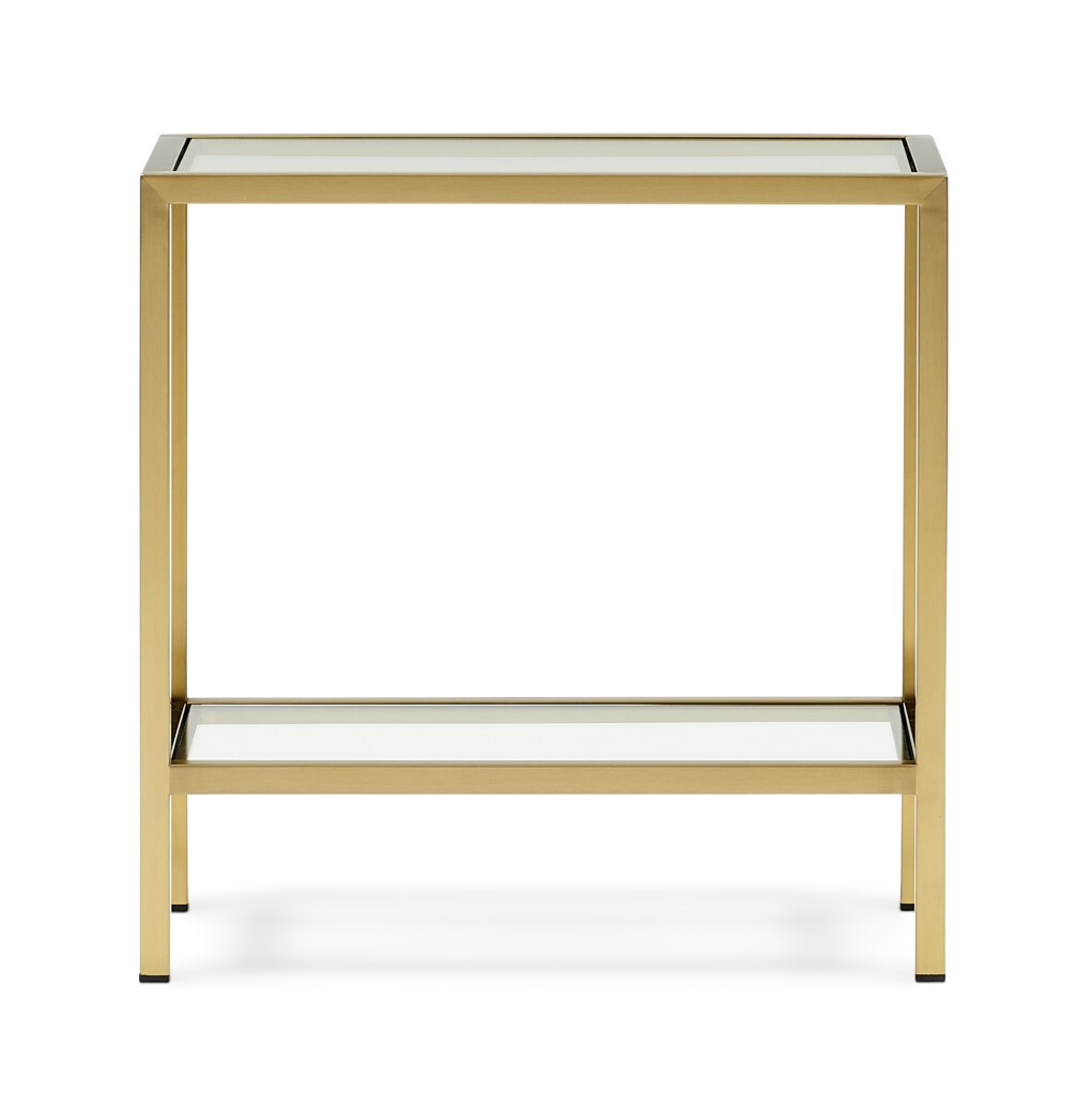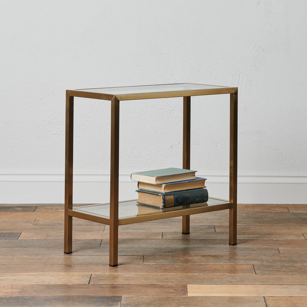 La silhouette élégante de Keswick et sa finition en laiton brillant évoquent le glamour raffiné de l'Art déco. La surface en verre et le plateau inférieur sont enchâssés dans un cadre en métal, avec des bords angulaires pour une sensation intelligente et sophistiquée. Les proportions rectangulaires élancées de cette table d'appoint sont parfaites pour être nichées à côté d'un canapé ou d'un fauteuil.