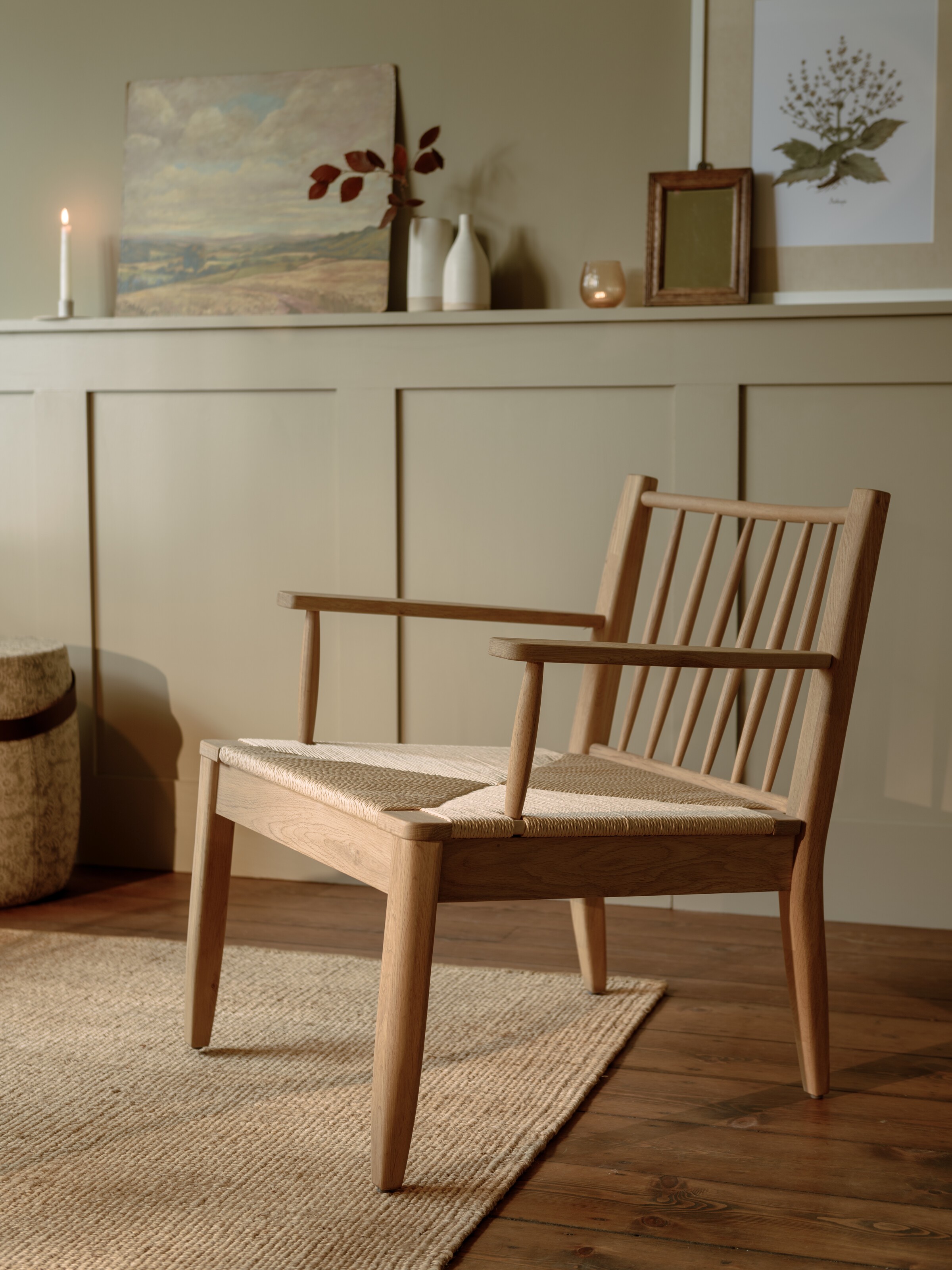 Le fauteuil Wycombe, élégant et posé, s'inspire des principes du design Arts & Crafts, avec des proportions raffinées et des profils en fuseau. Sa structure tactile en chêne massif et son assise en jonc tressé mettent en valeur la beauté des matériaux naturels et offrent un contraste bienvenu avec les tissus d'ameublement dans les espaces de vie.