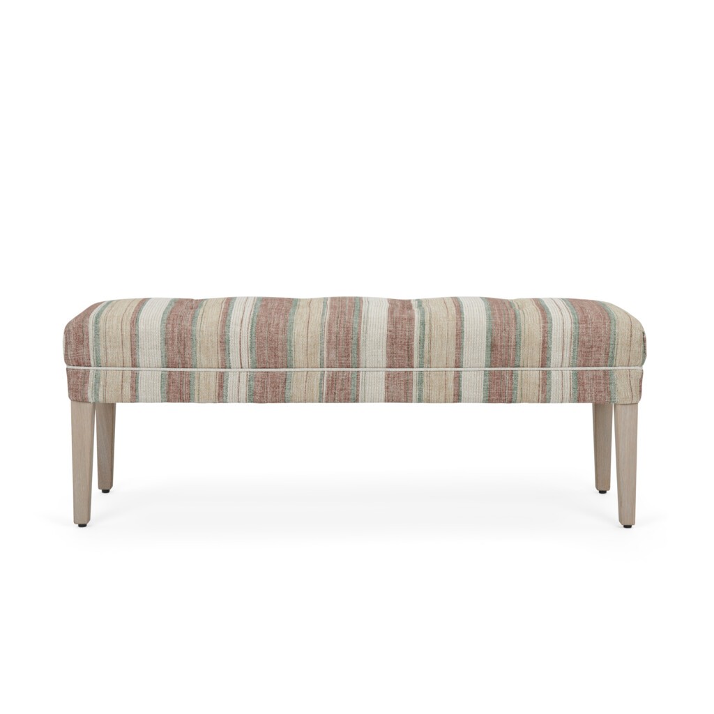 Ce tabouret Rupert en édition limitée est revêtu du tissu classique Carskiey Stripe de Fermoie. Le motif à larges rayures a été inspiré par des dessins d'archives découverts sur le domaine de Carskiey en Écosse, et il a depuis été réimaginé dans cette couleur rouille contemporaine. Rupert présente un design élégant et intemporel, avec des détails tuftés traditionnels sur l'assise et des pieds effilés en chêne.
