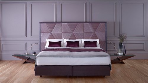 Un design spectaculaire composé de panneaux individuellement garnis et magnifiquement assemblés de façon géométrique, pour un aspect contemporain et graphique. Le bord de la tête de lit est recouvert d’une étoffe différente.