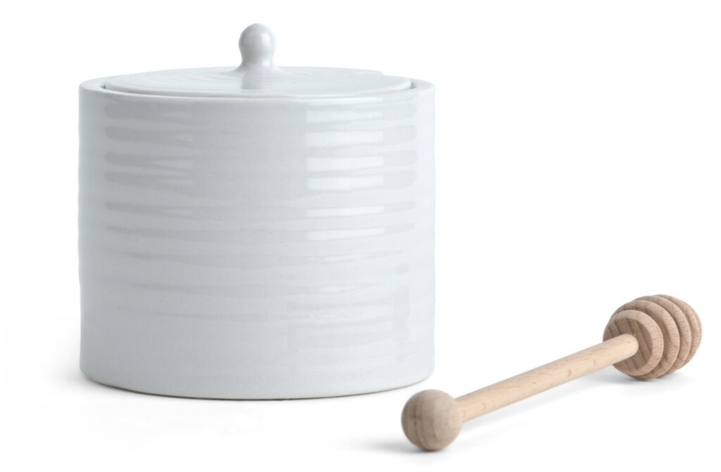 Ce pot à miel fait partie de notre ligne Lewes – une vaisselle pour tous les jours, loin toutefois d’être quelconque. Des pièces en grès quasi inusable recouvert d’un vernis brillant gris pâle et dont la surface est légèrement ondulée.