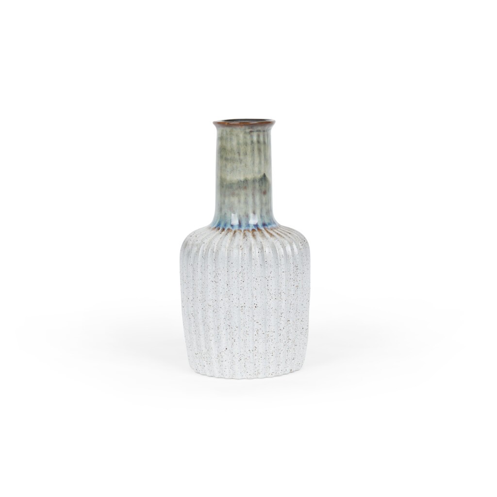 Fabriqué en grès résistant par des artisans qualifiés au Portugal, le vase Potterne est aussi beau seul qu'avec un petit bouquet de fleurs. Moulée en un haut motif ondulé, la glaçure réactive appliquée à la main se développe au cours du processus de séchage au four, révélant des tons neutres et bruns autour du corps, complétés par des teintes bleues dans le col lisse.